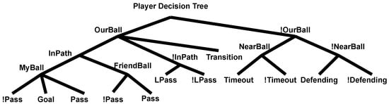 The game decision tree handles the game state and decides the skills desired for the situation represented in Figure 10. Each possible path in the game decision tree outputs a list of five skills. These skills are distributed between the players based on the other players’ decision trees (explained further). The tree can be readjusted and configured by a JSON file.