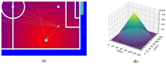In order to create a map of probabilities between robots regarding possible actions, a transformation needs to occur into a workable value. After trying to find an algorithm able to determine the highest probability path, the best solution was to use the log probability [25] to translate probabilities into arbitrary values representative of map distances. Log probability simply uses the logarithmic value of the probability in order to have an arbitrary value representative of its probability. The higher the probability, the smaller the distance. The formula to translate the probabilities is presented in Equation (4), with values constrained between 0 and 100. This upper limit serves to prevent computational errors and ensures the desired precision for operational efficacy. Figure 8 shows the Bayesian curve of an ideal pass probability over distance (a) and the respective log probability (b).