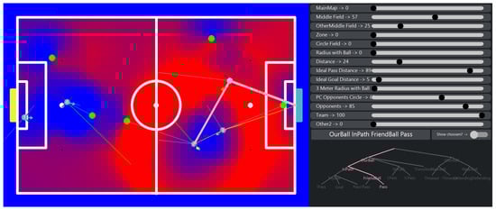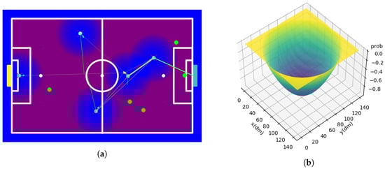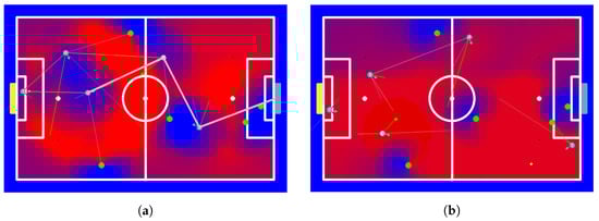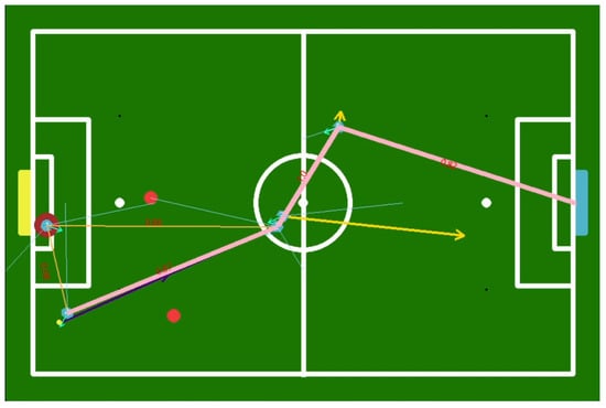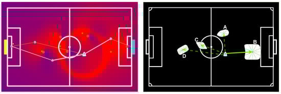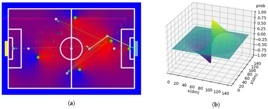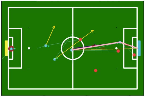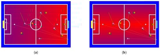 Figure 7a–c shows a possible pass with a high success probability and the influence of an opponent getting near the line of pass. In Figure 7c, the polygon surrounding the line of the pass is the limit of a possible pass. If the opponent intersects that boundary, the pass is not considered an available line.