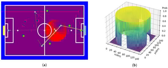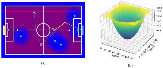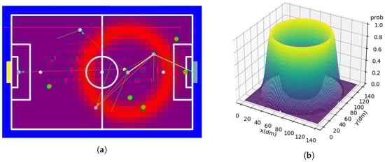 The probability of a pass or a goal is calculated based on the distance of the action and the opponent’s influence. The action success probability is based on a custom function for testing purposes, which is modified later for a real-world transition. The distance between two robots, given their location, is first calculated as seen in Equation (1). Then, the probability of a successful pass without any opponent’s influence is calculated in Equation (2). The meaning of the variables is presented in Table 2.
