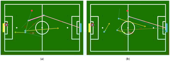 Third game situation in the simulator: (a) Initial situation. (b) Situation after the first pass.