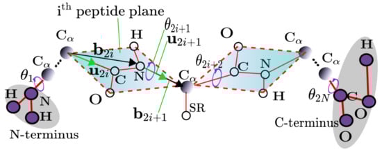 - Protein Configuration Vector: The nano-kinematic structure of a protein molecule comprising peptide planes can be comprehensively represented by a set of bond lengths and dihedral angle pairs. Considering the ith peptide plane , each pair of these dihedral angles represent rotations about the covalent bonds , namely, , and , i.e., (Figure 2). Additionally, the dihedral angle vectorrepresents the configuration of the backbone chain. Therefore, the vector encompassing the dihedral angles resides within the -dimensional configuration space . This space, formally defined as , represents the Cartesian product of individual unit circles , each corresponding to a single dihedral angle within the backbone chain.