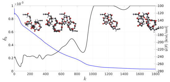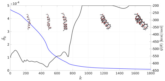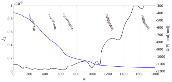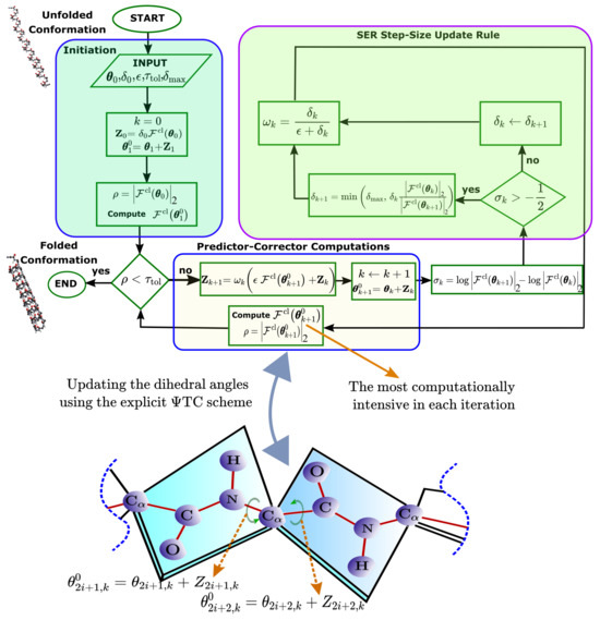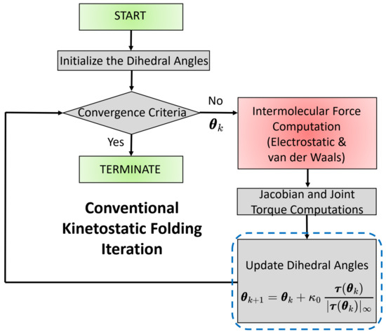 - Successive Kinetostatic Folding Iteration: Within the KCM framework, dihedral angles evolve kinetostatically under the influence of the kinetostatic folding torque vector resulting from the interatomic force fields. In particular, given an unfolded protein molecule conformation , the established kinetostatic compliance method relates joint torques to dihedral angle changes via the following numerical scheme (see, e.g., [5,51]):where denotes the set of non-negative integers, the ∞-norm of is defined as , and according to Equation (7).