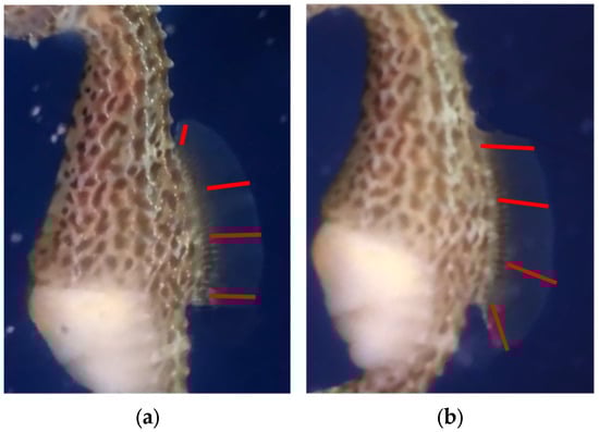 Seahorse dorsal fins inclining (red lines represent dorsal fin rays) (specimen in Shanghai Ocean Aquarium). (a) Seahorse dorsal fin (inclining upward). (b) Seahorse dorsal fin (inclining downward).