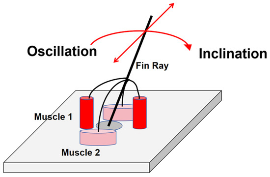 Specifically, each fin ray of the dorsal fin is joined to the spine and controlled by muscle groups. Two pairs of muscles control each fin ray: one pair of muscles (Muscle 2 in Figure 2) is responsible for the left–right oscillation, and a pair of thinner depressor muscles (Muscle 1 in Figure 2) control the pitch of the fin ray [19,20]. In other words, each fin ray has two degrees of freedom for rotation in two directions (Figure 2).