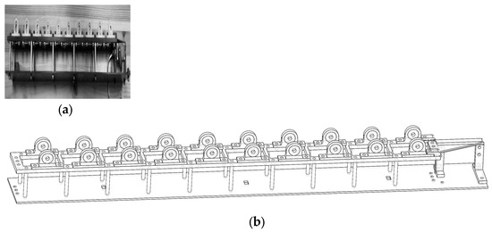 The mechanical structure of the tiltable oscillating fin thruster consists of three components: the framework, 10 fin rays and drive units, and the fin tilt linkage control system (Figure 4a). The overall length is about 600 mm, and the fin ray length is about 160 mm (Figure 4b).