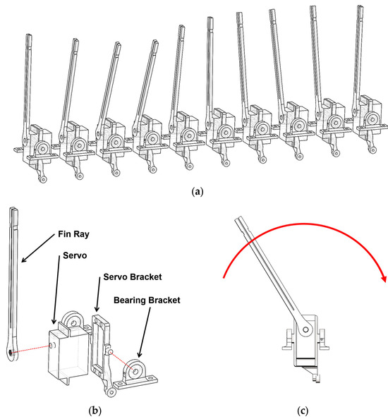 The thruster includes ten identical fin drive units (Figure 6a), with each unit’s fin ray being directly connected to a servo, allowing it to oscillate from side to side (Figure 6b). Additionally, it features a servo bracket, bearings, and bearing brackets.