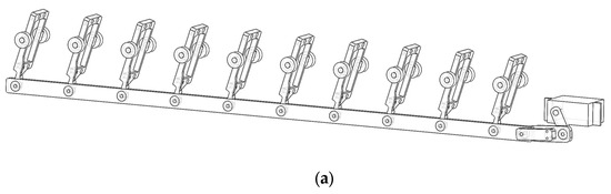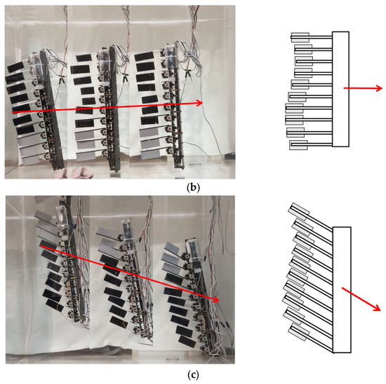 The fin tilt linkage control system consists of a horizontally positioned servo that drives a set of linkage-slider mechanisms, which move along a connecting rod back and forth, causing all ten fin drive units to tilt in parallel (Figure 7a). The tilt angle can range from vertical, i.e., 90 degrees, to approximately 40 degrees.