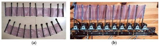 The fin surface is made of 1 mm thick rubber fabric and installed in an arc shape to accommodate the different strokes of the fin’s proximal and distal ends (Figure 8a).