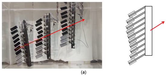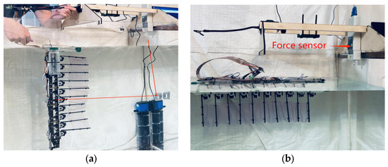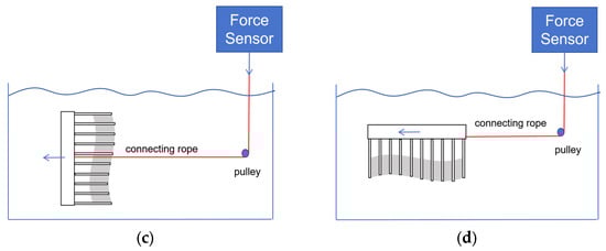 The propulsion device floated in the water, and the rope was horizontally connected to the device’s center of gravity, passing through a pulley on the right side of the tank and connecting to a high-precision force sensor on top of the tank (Figure 11).