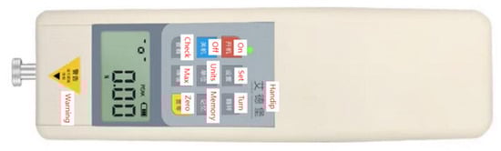 The force gauge used was HP-20 from Handpi (Figure 12), which is capable of measuring pulling forces up to 20 N with a resolution of 0.01 N and an accuracy of ±0.5%.