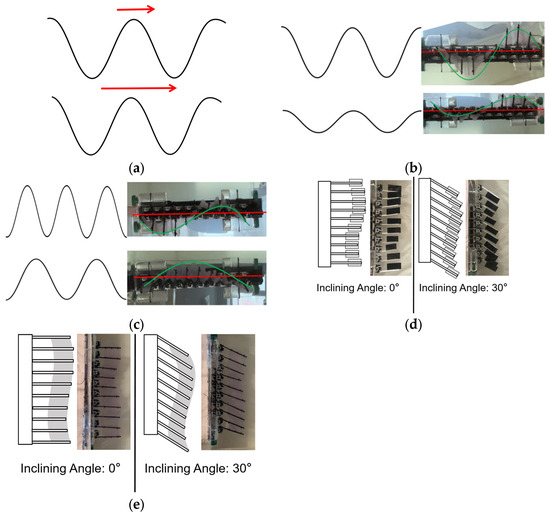 A demonstration of the variables. (a) Traveling wave velocity. (b) Amplitude. (c) Phase gap. (d) Inclining angle (discrete fin). (e) Inclining angle (continuous fin).