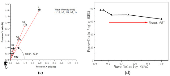 A comparison of wave velocities. (a) Demonstration of traveling wave velocity. (b) Magnitude of force on vertical and horizontal axes. (c) Force and wave velocity (coordinate system). (d) Force-X-axis angle.