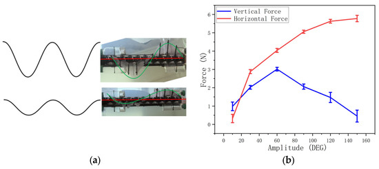 The traveling wave force is a force component in the spine direction caused by the traveling wave pushing water in the direction opposite to the wave traveling direction (Figure 25b). Moreover, it relies on a continuous fin surface, which explains why a discrete fin generates a smaller vertical force. As shown in Figure 25d,e, the CFD simulation demonstrates the static pressure in the situation where a sine wave moves 1 m/s in water. The pressure difference on two sides of the sine wave generates a force perpendicular to the fin surface, leading to a net force along the spine direction. This CFD provides a theoretical expatiation of the traveling wave force.
