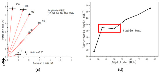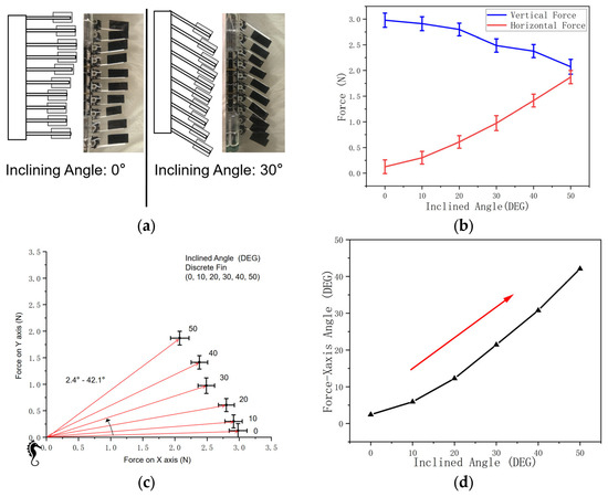The oscillating force is a force component that moves toward the direction in which fin ray’s point, caused by each section of the fin pushing the water from left and right (Figure 24a). Thus, upon changing the fin inclining angle, the oscillating force orientation changes in turn.