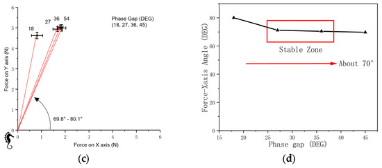 For force orientation, the inclining angle positively influences the angle between the net force and the horizontal axis, and the phase gap does not significantly influence the force orientation. (Figure 21b).