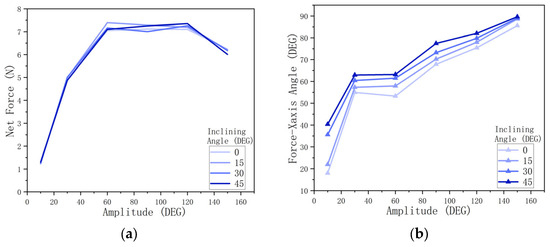 For force orientation, the inclining angle positively influences the angle between the net force and the horizontal axis, and amplitude positively influences the net force orientation from 10° to 60° and from 120° to 150° (Figure 20b).