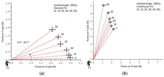Under the same conditions, the continuous fin generates a greater force in the vertical direction (y-axis) compared to the discrete fin. Additionally, the angle between the net force produced by the continuous fin (Figure 24b) and the x-axis is larger than that of the discrete fin (Figure 24a) under equivalent conditions.