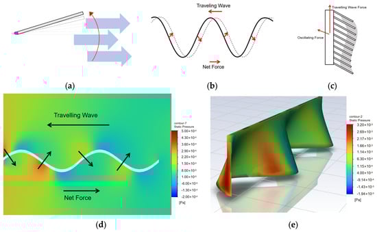 The net force component model. (a) Oscillating force. (b) Traveling wave force. (c) Net force model. (d) CFD simulation of traveling wave (2D). (e) CFD simulation of traveling wave (3D).