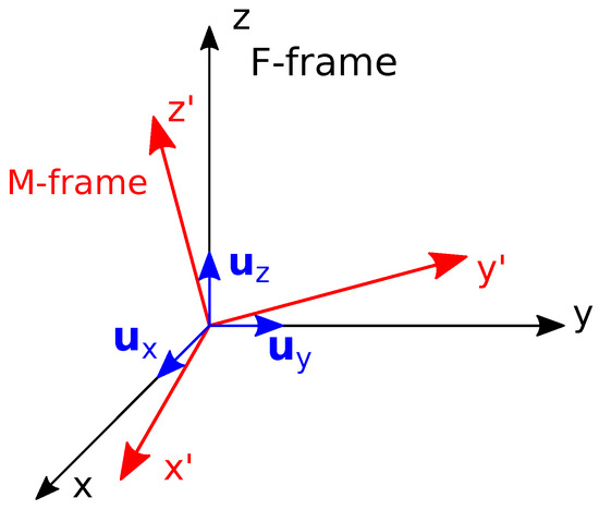 Let be three unit vectors that represent F-frame axes directions (Figure 1). When the sensor is placed in the first orientation of the calibration procedure, by using the Euler–Rodrigues formula [24], we can express in M-frame coordinates as follows:
