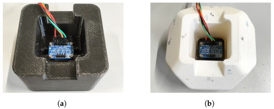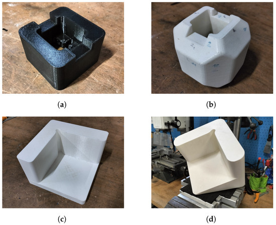 Simple 3D-printed IMU housings and references were produced to test the proposed method. This equipment includes a regular rectangular prism (prismatic) housing (Figure 2a), an 18-faced housing (Figure 2b) obtained by chamfering the edges of the former housing at 45°, a reference with three orthogonal surfaces and a base parallel to one of those surfaces (Figure 2c), and a reference with three orthogonal surfaces and a sloped base (Figure 2d). For each housing, a re-orientation scheme was defined to place the housing in at least every possible orientation where three of its faces are in contact with reference surfaces. Accordingly, and orientations were achieved in our tests for the prismatic and 18-faced housings, respectively.