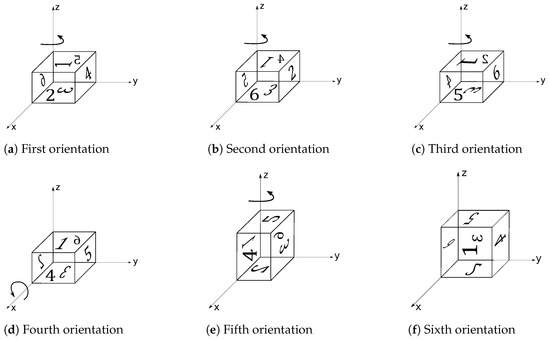 Figure 3 illustrates a schematic of the first six orientations of the scheme used for the prismatic housing. In each image, rotation arrows indicate the movement required to transition from the current orientation to the following, while represent the axes of the F-frame, which in practice can be identified with the three edges formed by the intersection of the three surfaces of the 3D-printed references (Figure 2c,d). The faces of the housing are numbered to make the rotation sequence clearer.Since the IMU is rigidly attached to its housing, as shown in Figure 4, if the housing is re-oriented into N different orientations, rotation matrices for can be computed as a combination of rotations around the axes of the F-frame. To achieve this, we begin considering that the rotation matrix , which transforms a vector expressed in the mobile frame into a vector expressed in the fixed frame when the IMU is in the i-th orientation, can be iteratively obtained from . This process depends on the axis around which the rotation is performed to transition from the -th to the i-th IMU orientation:
