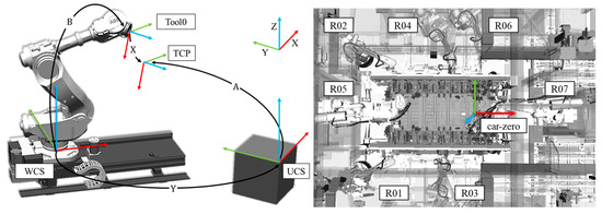 Coordinate systems used in industrial robot systems (WCS—world coordinate system, UCS—user coordinate system, TCP—tool center point) and an example of a car-zero reference frame in a multi-robot (R01–R07) manufacturing station.