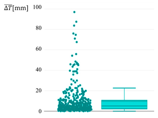 In the research paper, the implementation of industrial robot simulation programs into a real-world system was evaluated using the same methodology as the single measurement case described in Section 3.1. This evaluation was conducted across 485 measurements, resulting in verification of the true effectiveness of OLP implementation. Forty measurements originated from ABB robots while the rest of the performed measurements originated from KUKA industrial robots. The results were categorized based on Formula (11), which calculated the absolute average translation difference between the real system and the simulated system.