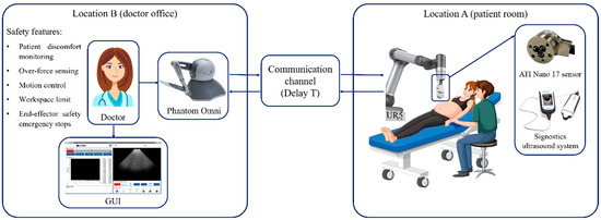 Figure 1 illustrates the HaptiScan system’s architecture, showing the setup in the patient room and the doctor’s office. The diagram highlights key components like the ATI Nano 17 sensor, Phantom Omni haptic device, and safety features including patient discomfort monitoring and emergency stops, connected via a communication channel with delay. The HaptiScan integration allows operators to remotely perceive the interaction forces between the ultrasound probe and patient. The system employs the UR5 robot from Universal Robots, a commercially available manipulator certified as a collaborative robot compliant with industry safety standards, which is teleoperated over the internet via a commercially available haptic interface (Phantom Omni). A portable ultrasound probe and a force/torque sensor (F/T sensor) are integrated into the UR5′s end-effector. The F/T sensor measures the forces of interaction between the ultrasound probe and the patient’s abdomen. This force data, along with ultrasound information, is transmitted to the operators over the internet, assisting them in performing the teleoperated procedure while ensuring the manipulator operates within a predefined safe workspace. Additionally, stereovision is provided to enhance the operator’s perception of the manipulator and its environment.