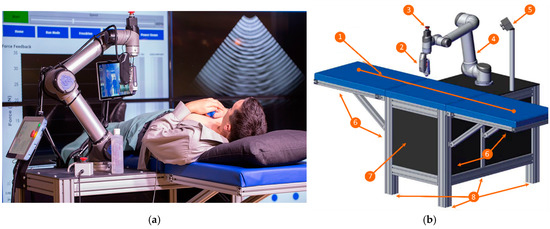 Figure 2a, is developed to accommodate a UR5 robot as the slave manipulator, its controller, (three active and three passive) Phantom Omni haptic device (formerly SensAble Technologies, Woburn, MA, USA) as the master manipulator, and other essential components, most importantly, the patient. This platform is designed to be easily movable, allowing it to be transported to locations requiring emergency medical diagnostic procedures and controlled over the internet.