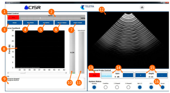 Figure 7 presents the graphical user interface (GUI) developed to interface with the HaptiScan system. This interface provides the operator/sonographer with the ability to control the robotic manipulator and monitor various aspects of the system, such as applied forces, patient discomfort, and system connection status.