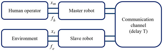 In addition, the contact force from the environment is relayed from the slave to the master through the communication channel, introducing a communication delay. This contact force, sent to the master manipulator’s motors, can be expressed as follows: