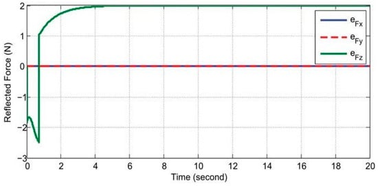 denotes the force exerted to the master manipulator’s motors reflecting the contact force experienced by the slave side from the environment.