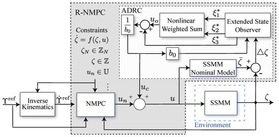 The NMPC strategy uses the nonlinear dynamic model of the SSMM, as set by Equation (7), to predict the future system response in a finite prediction horizon, N. A control sequence is optimised in accordance with the minimisation of the cost function, whereby the tracking error is subject to state and control input constraints. Moreover, the control system uses prescribed references for the position and orientation trajectories of the SSMM, constraints according to model boundaries, and the actuators of the robotic system (see Figure 2). The NMPC uses the sliding horizon technique, which solves an optimisation problem along the N horizon that is continuously updated at each time instant. The solution of the optimisation problem provides an optimised sequence of control actions, . However, only the first control action of this sequence is applied to the robotic system. The optimisation problem is given by: