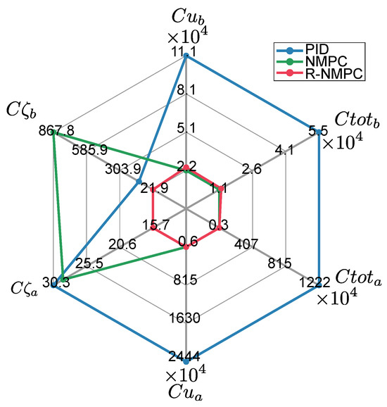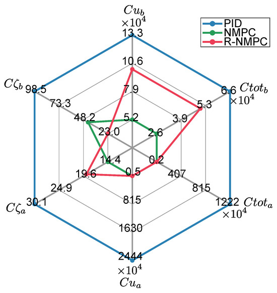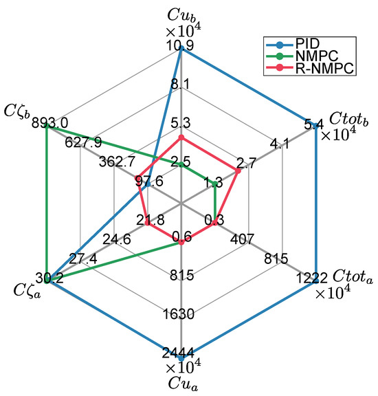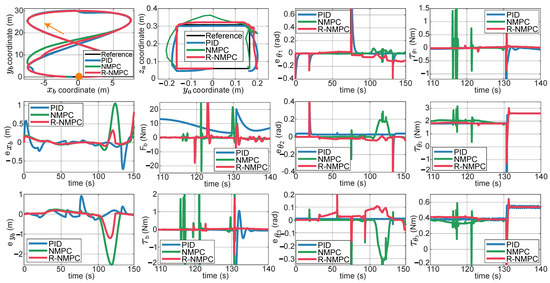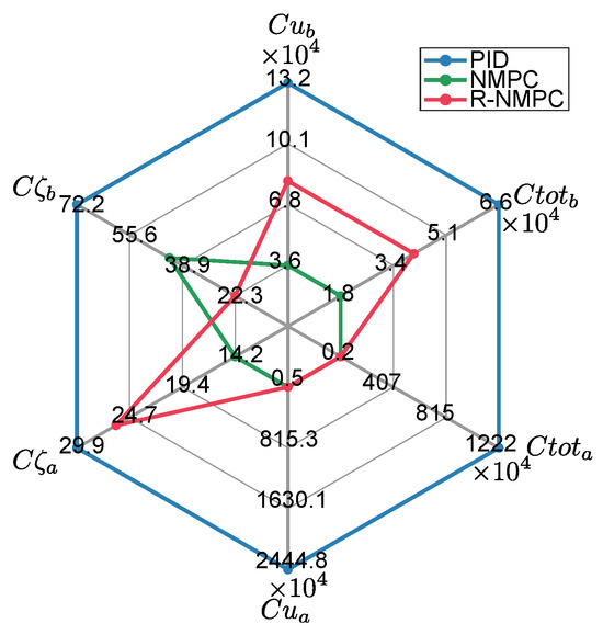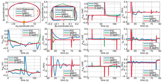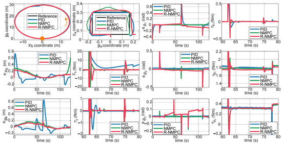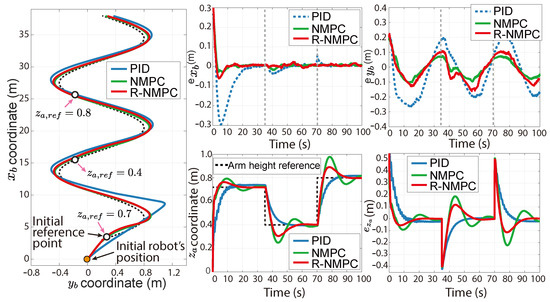 Tests were carried out on two trajectories for the mobile base. The first one was a circular trajectory. Figure 9 shows the tracking error for the mobile base. The PID controller still presented overshoots when the controlled system was affected by lineal and rotational speed disturbances, as well as under indirect disturbances caused by the motion of the robotic arm joints. The NMPC and R-NMPC mitigated this phenomenon by maintaining the tracking error close to zero. However, the NMPC tends to show larger errors and even loses efficiency. It was also shown that the tracking error in increased by up to 0.6 m, indicating that the system’s response was delayed and that it did not return to the original point. Analysing the performance indexes (Figure 10), it can be seen that the NMPC and R-NMP controller had a 55% and 76% improvement, respectively, compared to the PID. In the worst-case scenario, the R-NMPC showed a reduction in tracking error for joint coordinates, with a maximum error of 0.1 rad when prioritising base trajectory tracking. Figure 9 demonstrated that the R-NMPC controller achieved smaller overshoots compared to the NMPC and PID controllers. Overall, the proposed controller maintained the tracking error near zero during all the simulation tests. Analysing the total tracking error, Figure 10 shows that NMPC and R-NMPC achieve improvements of 52% and 37% over PID, respectively.