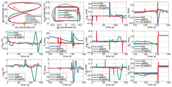 The first trajectory to be considered for the robot base is a circle with radius of 15 m. A square trajectory with a width of 0.35 m and a height 0.25 m is used for the robotic arm. In addition, a constant speed of 0.5 m/s is considered for the calculation of position and orientation coordinates. Figure 4 and Figure 5 show the performance metrics and trajectories achieved by the three controllers under analysis. It is important to note that a portion of the total test time is extracted to show the transient response of the control signal performance for each signal. Position changes in the robotic arm were given at time 15, 65, and 115 (s), which caused an overshoot in the tracking error of the robotic arm and in the manipulated variable. This phenomenon is also reflected in the base and is taken as the bidirectional disturbance due to the mechanical coupling. The NMPC and R-NMPC controllers minimise the effect of disturbances and prioritise trajectory tracking. Because of this, the of NMPC and R-NMPC is smaller than PID by 40% and 69%, respectively. The PID controller is the least effective at rejecting disturbances. The R-NMPC is the controller with the lowest error in the position coordinates of the mobile base (), as shown in Figure 4. Similarly, disturbances in the moving base are reflected in the robotic arm, but with smaller overshoots. A positional discrepancy is observed in the robotic arm’s motion under the influence of the R-NMPC. This could be attributed to the controller prioritising the trajectory tracking of the base and partially sacrifices the performance of the joints. For this R-NMPC, is 19% higher than the NMPC. Despite the control efforts to prioritise the movement on the ground (see Figure 5), the NMPC and R-NMPC performance indexes and have an improvement of 72% and 40% compared to PID, respectively (see Figure 4).