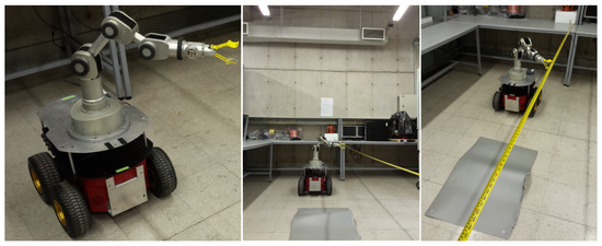 To tune the parameters of the NMPC controller, a heuristic method was used by considering the trade-off between the tracking errors and control input effort of both base and arm (see Table 2). The matrix of weights , , and are used for the NMPC and R-NMPC configuration. The first five elements of the diagonal in and penalise the tracking error for position variables of the SSMM according to Equation (1). The variable is taken as a priority because it is the manipulator base and is highly susceptible with respect to changes in the other joints. The second priority is the translational motion of the robot base. The weights of the following variables were set according to non-oscillatory and stable responses. Using a similar insight, values for the penalisation of control inputs by means of were found, prioritising the control of the second and third joint coordinates of the SSMM. In addition, the remaining model parameters required for the ADRC compensator in the mobile base are further detailed in Table 3. For normalization purposes [24], the configuration parameters and for the observer and control were set to values less than 1. The parameter was found based on how fast the system compensates for disturbances. Parameter was chosen to prevent the system overshoot in the SSMM responses. The remaining parameters were chosen according to the best system response of the experimental tests.