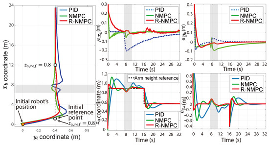 To evaluate the performance of the proposed controller against unexpected disturbances, a time range between disturbances followed by a change of joint position was also set. Then, there were more control requirements, which can be seen in Figure 7. In this instance, it can be observed that both PID and NMPC tend to generate control responses with overshoots. On the other hand, the R-NMPC controller maintained a stable response without compromising its performance in the mobile base. Figure 8 illustrates that the R-NMPC showed an improvement of 89% and 79% in terms of tracking error for the mobile base compared to the PID and NMPC, respectively. The robotic arm shows a tracking error at this time but meets prioritising the mobile base and the reference motion on the ground. Figure 8 shows that the R-NMPC obtained an improvement of 14% and 27% over the PID and NMPC in terms of tracking error for arm coordinates. With respect to the control effort, RNMPC and NMPC had 76% and 58% improvements, respectively, in comparison to PID. These values correspond to a reduction in the tracking error compensation. In both trajectory-tracking tests, the R-NMPC controller demonstrated better performance while minimising the trajectory-tracking error of the mobile base. Indeed, the proposed control strategy could mitigate the impact of recurrent disturbances in the SSMM system and facilitated the generation of a less oscillatory control effort.