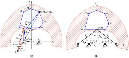 Because of the symmetrical design of the five-bar linkage, the first two conditions are the same for the opposite chain, E0DC (see Figure 1b). For an analytical solution to the general synthesis method, it is necessary to transform the previous inequations into an equation system, by considering a supraunitary coefficient multiplied with the lower term in the inequation and accepting :