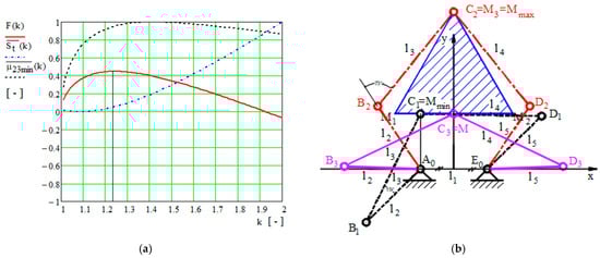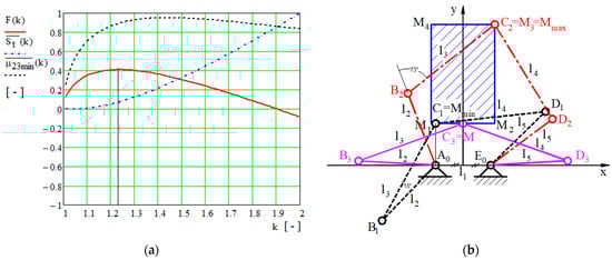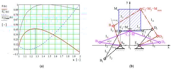 Figure 2a shows the variation in the normalized minimum input transmission angle , the normalized rectangular total size of the surface of the five-bar linkage , and the target function in regard to the range of the coefficient , and in regard to the input values presented in Table 1 and Table 2. The maximum value of the normalized minimum input transmission angle occurs for the coefficient at , the minimum value of the total size of the surface of the five-bar linkage is , and the maximum value of the target function is . The geometrical parameters of the optimized five-bar linkage are detailed in Table 3 and are shown regarding the critical points in Figure 2b.