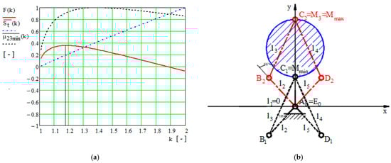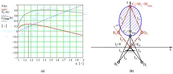 Figure 3a shows the variation in the normalized functions , , and the target function for coefficient and the values detailed in Table 1 and Table 4. The maximum value of the normalized minimum input transmission angle occurs for the coefficient at , the minimum value of the total size of the surface of the five-bar linkage occurs at , and the maximum value of the target function occurs at . The geometrical parameters of the optimized five-bar linkage are detailed in Table 5 and the critical points are shown in Figure 4b.