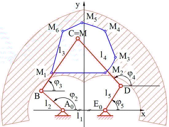The vector of the input parameters of the five-bar linkage is and the vector of the output parameters is (see Figure 7).