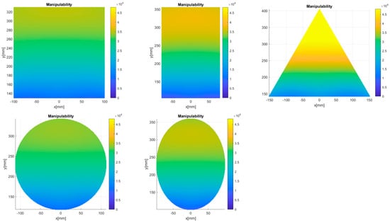 Manipulability distributions inside the workspaces (square-shaped workspace (top–left), rectangular-shaped workspace (top–center), triangular-shaped workspace (top–right), circular-shaped workspace (bottom–left), and elliptical-shaped workspace (bottom–right)).