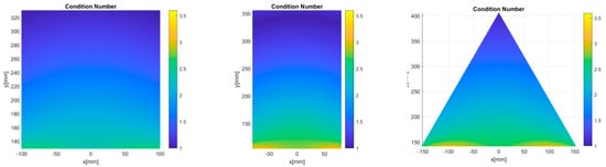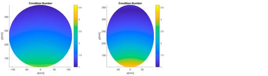 The condition number index (K) is closely tied to the structure’s dexterity. The computation of the condition number index is described as the ratio between the maximal and minimal values of the singular values () in the Jacobian matrix [39,40].