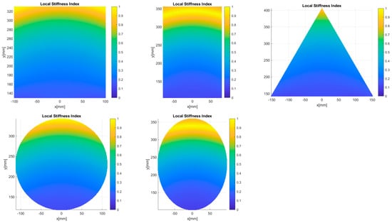 Local stiffness index distributions inside the workspaces (square-shaped workspace (top–left), rectangular-shaped workspace (top–center), triangular-shaped workspace (top–right), circular-shaped workspace (bottom–left), elliptical-shaped workspace (bottom–right)).