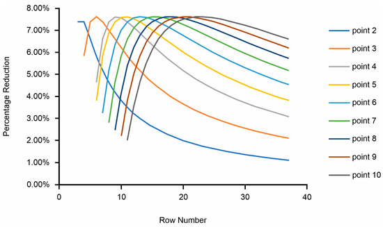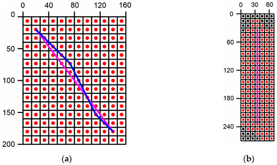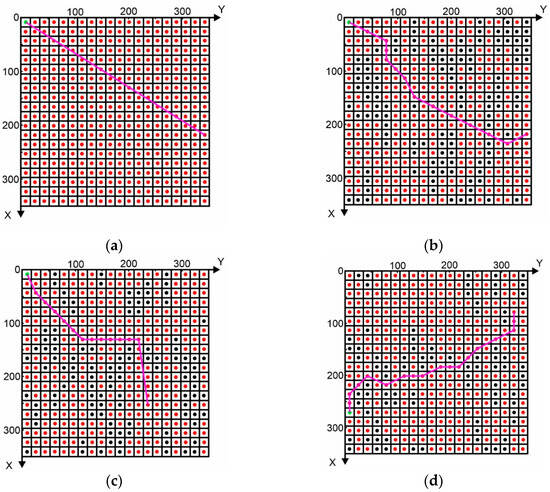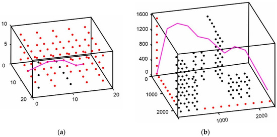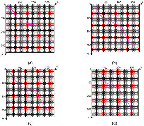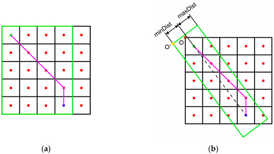 where ad is the length of a subregion of the 3D grid. Then, for each point on the path, it is initially checked whether it is above or below the reference line and then its vertical distance from the reference line is calculated. Depending on the area where it is located, it is examined whether the calculated distance is greater than the value of minDist or maxDist. If the distance is greater, the minDist or maxis’ value is updated to the point’s distance. Equation (2) is used to calculate the perpendicular distance from a point to the reference line.
