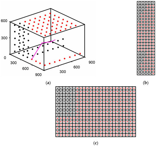 The simple grid environment method creates the environment by projecting the coordinates of the start and end points of the 3D path onto the reference plane. Namely, it creates a rectangle that encloses the generated path. The rectangle’s boundaries are defined by the squared subregion’s coordinates representing the discrete points of the 3D grid. In order to ensure consistency between the 3D and 2D grids, each subregion of the 3D grid is divided into n