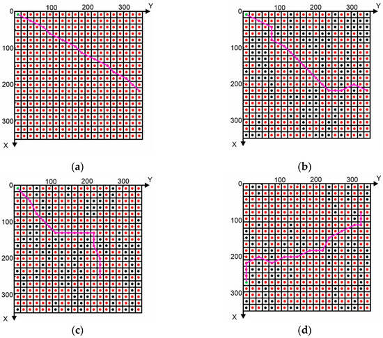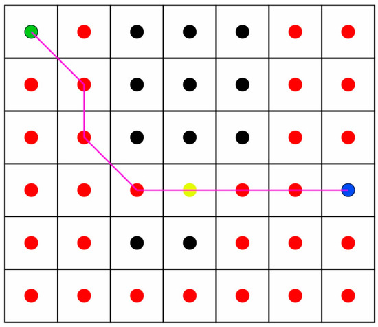 Figure 2b shows the results in a dense grid environment. The discrete points where the robot can move are represented in red, while the obstacles are represented in black. The formed path is shown in magenta.