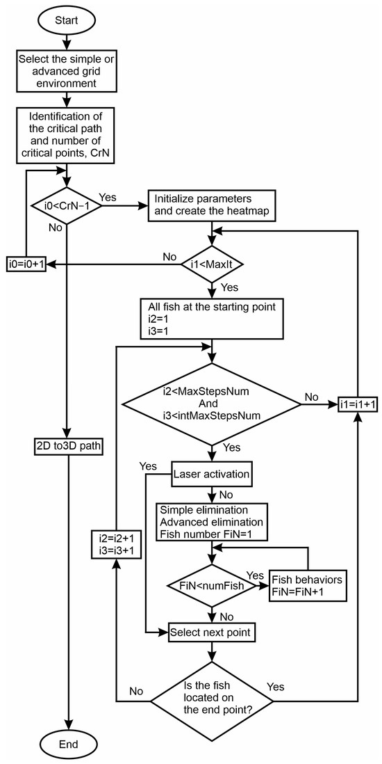 The advanced grid method creates discrete movement points for an area of 18,900 mm2, while the simple grid method creates discrete movement points for an area of 32,000 mm2. This implies that for the same number of discrete points, the advanced grid method creates a denser grid with more obstacles, thus increasing the accuracy of the planned route, while the presence of obstacles eliminates some choices of the next possible point selection and expedites the fish to find the optimal path without waste time exploring paths that are far from the optimal. On the other hand, the simple grid method allows the exploration of paths in an environment with the same dimensions as those used for the 3D path search. In this way, routes that are significantly different from the optimal path can be examined more extensively.