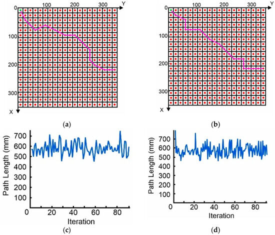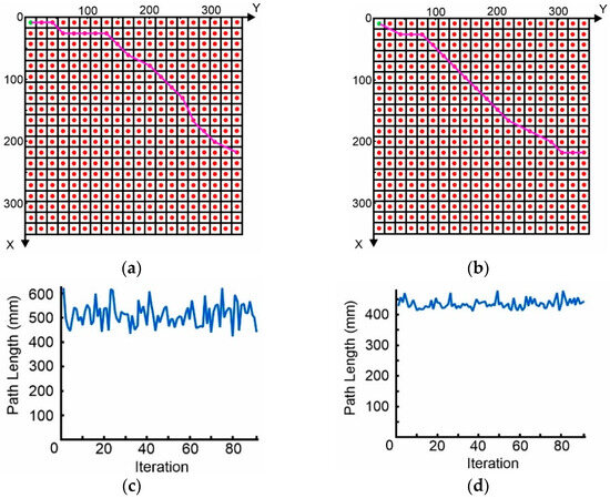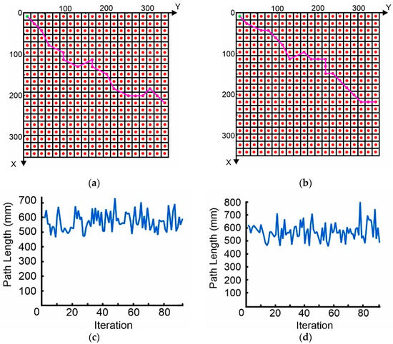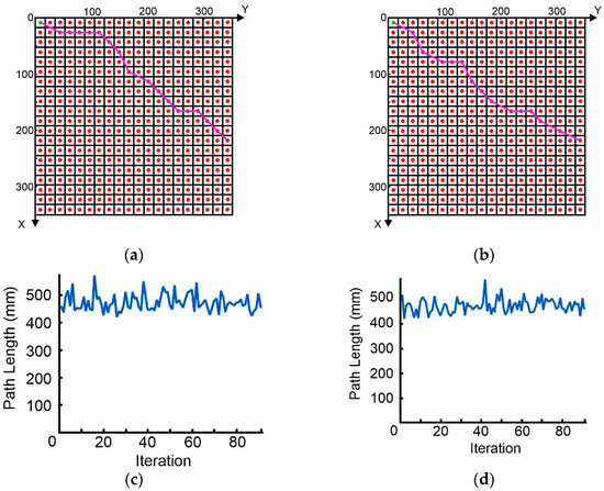 Figure 23c,d shows the diagrams for each process. The heatmap use seems to stabilize the formed path and eliminate all unnecessary oscillations that lead to an increase in the length of the formed path. It can also be seen from the path length diagrams that the formed routes are shorter compared to the previous methodologies and the solutions with reduced lengths are systematically approached.